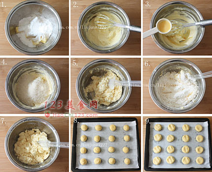 9、将小圆球轻轻按扁成小圆饼。然后放入预热好的烤箱中,上火180摄氏度下火150摄氏度烤约18分钟。