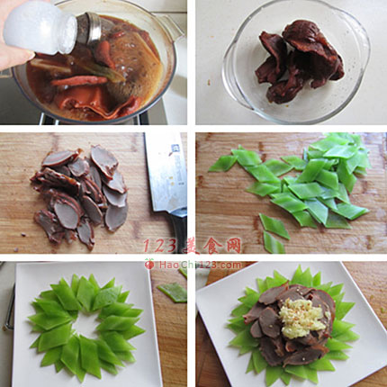 9、将卤煮好的鸭胗切成片。