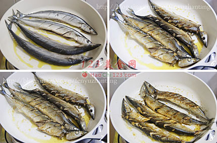 6、用中小火煎制秋刀鱼,煎至两面微黄。