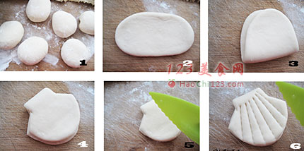 4、用刀划出贝壳的轮廓(四刀成型,多余的面团放在一边)。