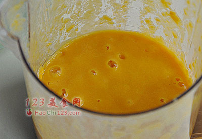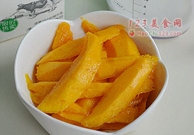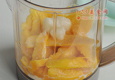 2、将芒果果肉、鲜牛奶、蜂蜜倒入搅拌机。