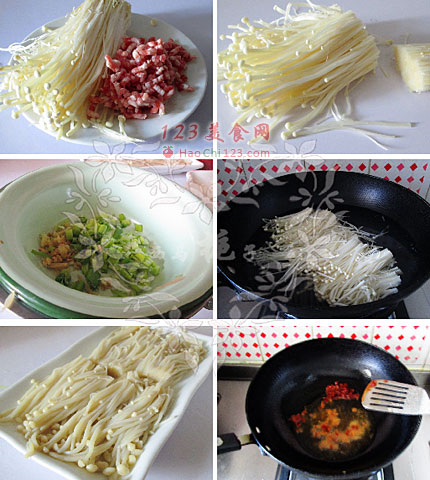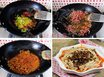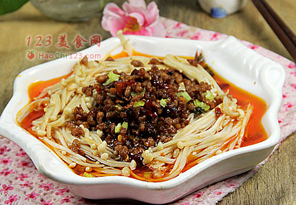 10、将炒好的鱼香肉沫浇在金针菇上即可。