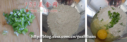 2、适量面粉放入盆中,加入葱花和一个鸡蛋。