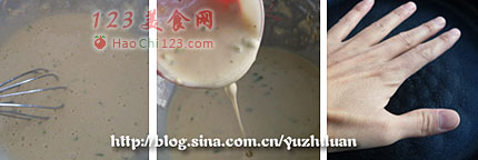 5、如果面糊调的稀一些的话摊出来的饼比较薄,如果面糊稠一些的话摊出来的饼就会稍微的厚一些,我调的面糊就是用勺子舀起来往下倒得时候能轻松的拉出比较细的直线来。