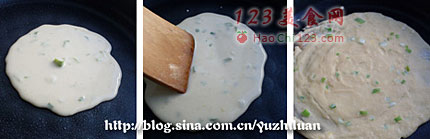 7、舀一勺面糊放锅里,用铲子快速的转动一圈,将面糊摊薄。