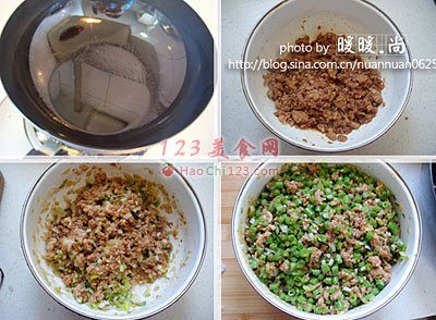 2、将热油浇在剁好的肉馅上,加适量的老抽、鲜味生抽、盐调味。