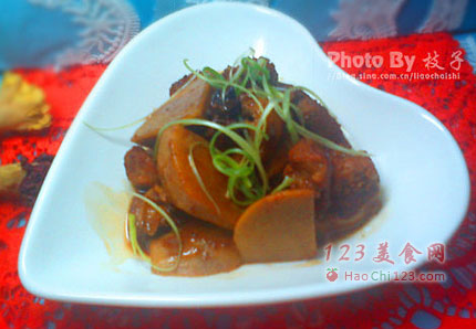 4、然后再加入适量的耗油,将耗油翻炒均匀后加入料酒两小勺、适量的清水。清水的量以盖过食材为准,大火烧开后,小火烧上半小时左右,调入适量的食盐,葱,少量的糖提味就能出锅了。