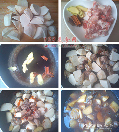 3、热锅下油(不要太多,因为排骨里面有油),放入姜片,八角、桂皮煸出香味后倒入沥干好的排骨进行煸炒,煸至排骨两面微黄时倒入切好的芋头,翻炒几分钟(我通常喜欢吃焦一点的,就炒到芋头表皮皱起来的样子)。