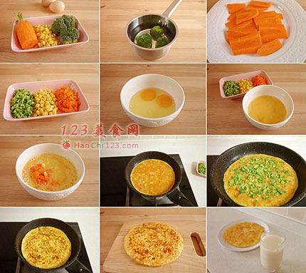 3、将鸡蛋打散,加入胡萝卜泥,甜玉米粒,少许盐,拌匀。