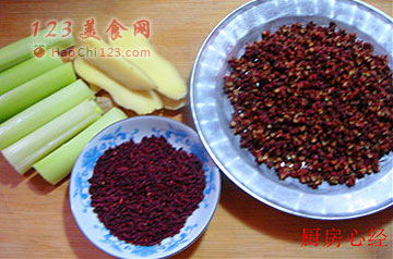 4、在清水中放入葱姜、料酒,一半的花椒,每斤肉放入5克的红曲米上色。大约煮50分钟。