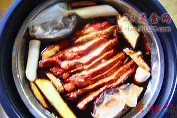 7、在容器中注入开水、盐、酱油、料酒,要盖过肉片。将容器放入电压力锅的内胆(内胆中提前注入水),选取肉类挡,正常蒸制即可。