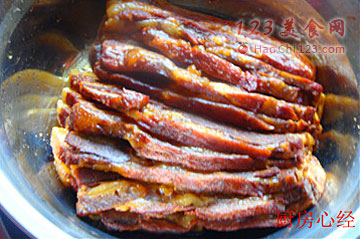 8、蒸熟以后,到出容器内的汤汁,在将肉片倒扣在盘中即可。