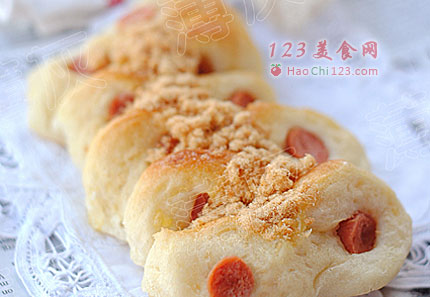 16、面包出炉冷却后,在表面挤上一些沙拉酱,并粘上肉松即可。