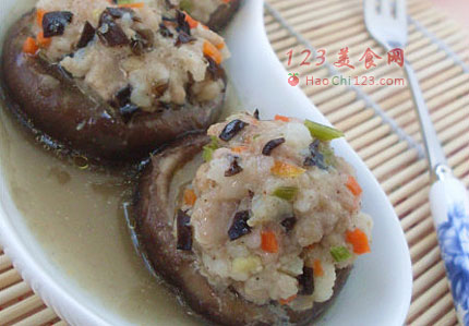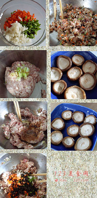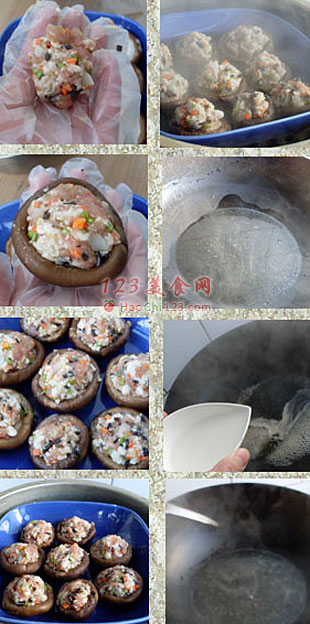 6、将肉馅团成小丸子,摁到香菇伞上。