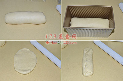9、接下来做三峰原味吐司,取一面团先擀成椭圆形。