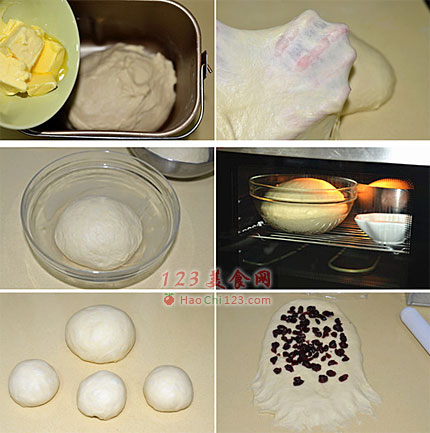 6、先做蔓越莓单峰吐司:将大面团擀成椭圆形翻面后底边压薄,撒上蔓越莓干。