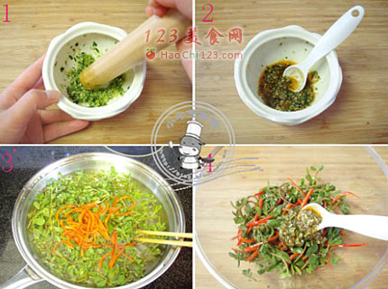 4、将汆烫好的马齿菜捞起冲凉开水,然后将挤干水分的马齿菜和调味料拌匀后即可食用。