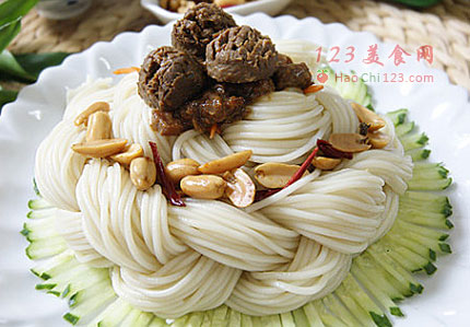 7、用剪刀将顶端的棉线剪开码入盘中(如果系棉线一端的拉面没煮透,可用刀切去),摆好造型,放上萝卜丝,淋入酱,撒上黄飞鸿麻辣花生即可。