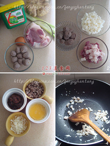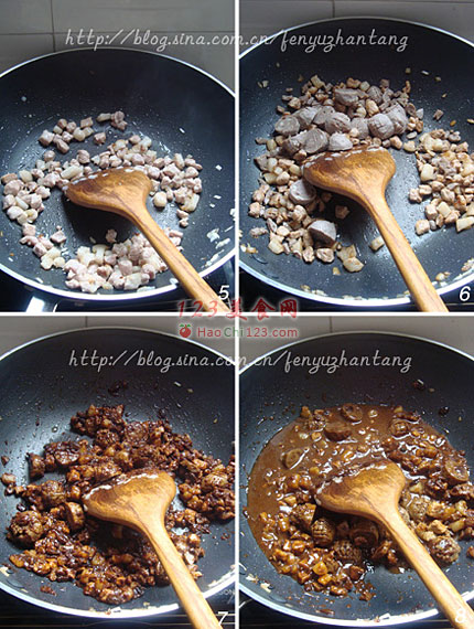4、热锅下油爆香大葱粒,然后放入上肉肥肉丁煸炒出油。