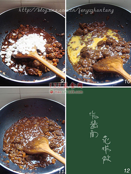 10、11、当把水炒至与酱完全融合,酱中又往外出油的时候倒入鸡蛋液,翻炒匀即可。每次多做一点,要吃的时候加点水热一热,也很美味。