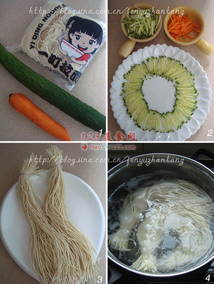 2、黄瓜、胡萝卜切成丝,黄瓜丝码入盘中摆好造型。