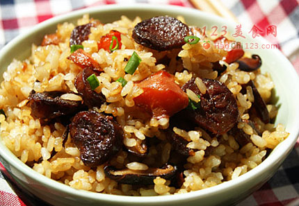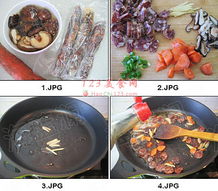 4、倒入腊肠和香菇翻炒出香味,加入胡萝卜,再加少许料酒。