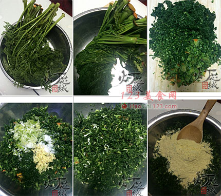 3、捞出冲凉,沥干水分,切碎,然后攥干水分。