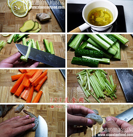 4、切去黄瓜内瓤主要是防止内瓤过多出水,过分稀释了浸泡的汤汁,而且带内瓤泡出的黄瓜条也不够爽脆。虾汆烫后过冰水的目的也是让虾仁口感更清脆。