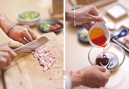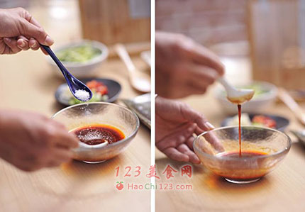 2、将凉开水、酱油、番茄酱、醋和辣椒油混合。