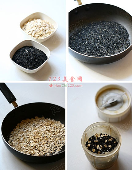 5、做法二、是将打碎的芝麻燕麦粉加水煮熟,所以可以用生芝麻和生燕麦片来制作。
