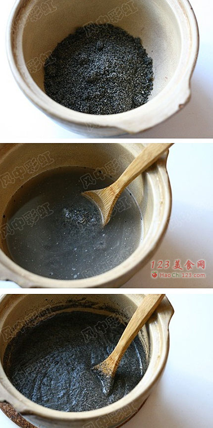 8、一边加热一边搅拌,至芝麻糊浓稠即可。