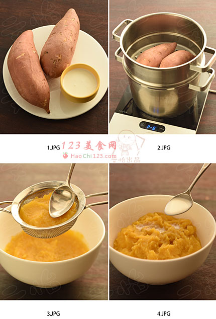 1、蒸好的红薯泥压细腻,再加上一点点淡奶油,特好吃,特简单,你试试看。红薯泥要尽量碾的细腻一些,不怕麻烦的话过下筛最好,这样口感才更好哦!
