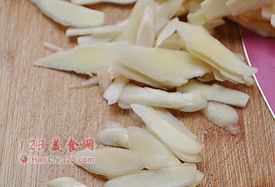 2、将子姜切成薄薄的片。切薄一些,容易浸泡入味,而且我觉得作为一枚小泡菜,入口就得是薄薄的一片,感觉才对,厚厚的姜片是炖菜用的。