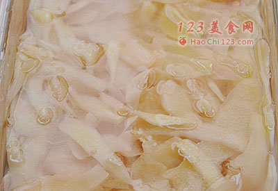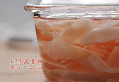 7、多泡些天,姜片会带有一点淡淡的粉,很漂亮。我更喜欢把嫩姜多泡几天再吃,那时候姜的味道没有开始的时候那么“冲”,更好吃呢。