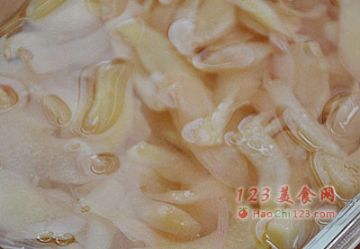3、加少许盐、抓匀,腌15分钟。十几分钟后,用手将姜片攥一攥,攥出姜片里多余的水分。上图就是攥出的姜汁,也别浪费了,夏天做个凉拌菜正好用得上。