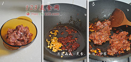 3、倒入腌制好的肉糜中火翻炒至肉末全熟。