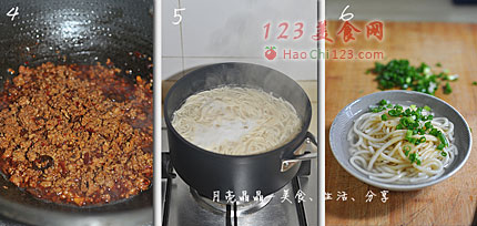 6、把面条盛入面碗,同时浇一些煮面的汤,放入1汤匙生抽,撒些葱花,把炒好的辣肉铺上OK拌匀开动。