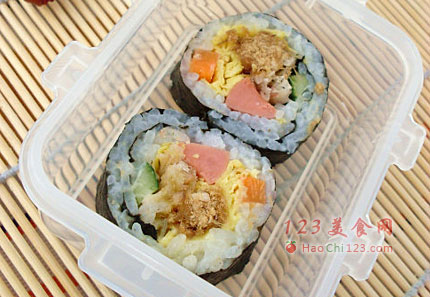 7、从海苔的一边,也就是有馅料的那边开始卷,具体卷法请看这里寿司情缘,以前有详细介绍,有一点啊,一定好边卷边往外抻帘子,千万别把帘子卷里边。
