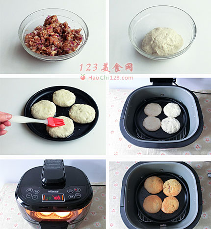 6、烤盘中刷一层食用油,放入包好的饼。