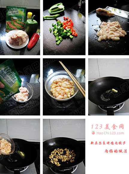 7、加入腌制好的鸡肉丁。