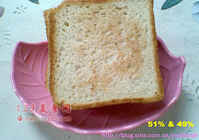 3、将平底锅微微烧热,放入面包片稍稍烤一下,掌握好时间和火候,时间太长的话面包片会变得难嚼,火大极易烤糊,烤成两面稍稍显金黄色即可。