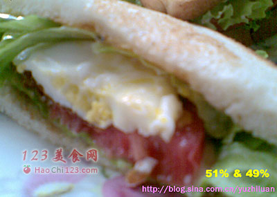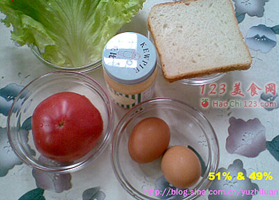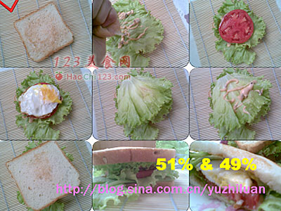 4、将面包片平放再案板上,先放上生菜,挤上沙拉酱,放西红柿片,放煎好的蛋,再放生菜,挤酱,最后再放上一片面包片即可。