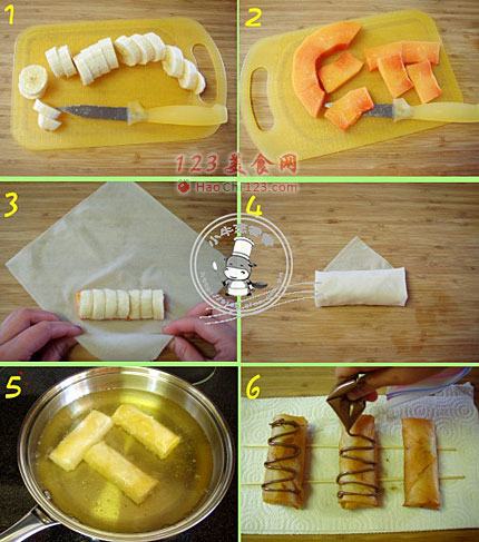 1、内馅的水果也可以用芒果代替,春卷皮在超市冷冻饺子柜台有售。