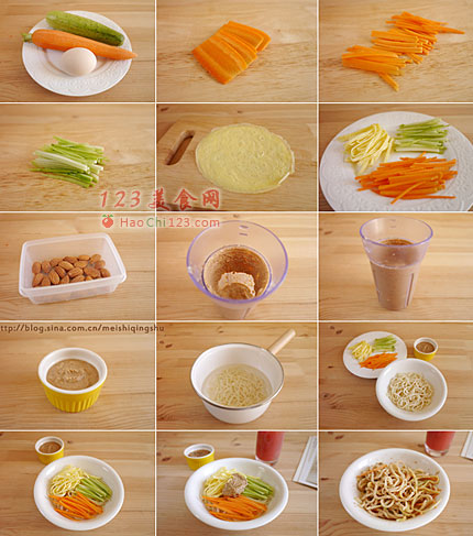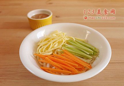 3、煮一小锅热水,下面条,煮熟后捞出盛盘,摆上小黄瓜丝和胡萝卜丝,浇上杏仁面酱即可。