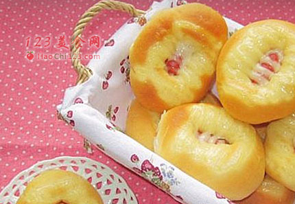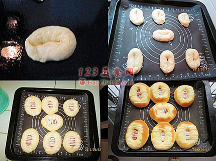 5、整齐的排放在烤盘里,放温暖处再次发酵至2倍大,火腿肠对半切开,放在中间,沙拉酱放进裱花袋,裱花袋剪个小口,随意挤在火腿肠上,烤箱170度预热,中层上下火12分钟即可。
