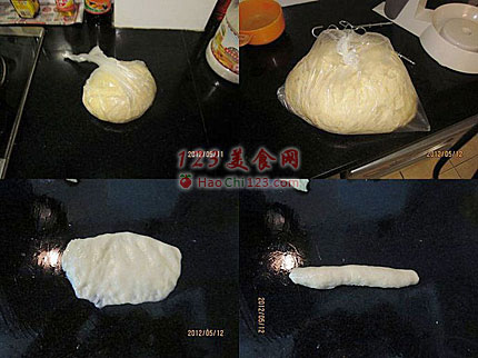 4、将松驰好的面团再次排气,碾成长舌状,压平底边,揉成一条长形,再一边揉长,一边压扁一点,包好,卷成一圈(好像表述的有点混乱,不知道该怎么说,看过程图来了解吧)。