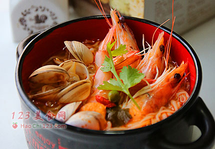 贴士:冬荫功汤可以说是代表泰国料理的招牌汤菜,也是世界十大名汤之一。冬荫功汤是泰国大街小巷、大店小馆里最常见不过的一道泰菜,到泰国如果不喝上一碗冬荫功汤那你就算是没有去过泰国。在泰语中,“冬荫”指酸辣,“功”即是虾,两者加起来就是酸辣虾汤的意思。冬荫功汤的用料格外丰富,大头虾、泰椒、鱼露、香茅、咖喱、椰奶、草菇、青柠檬等当然是其中最经典和不可少的食材。入口酸辣直上鼻腔的冬荫功汤,初尝时也许会觉得好刺激,不过相信不少人习惯了这种过瘾的刺激之后就会贪恋上它。十八世纪泰国吞武里王朝时期,华人郑信王当政,淼运公主生病了,什么都不想吃,郑信王就叫御厨给公主做点开胃的。想不到公主喝了这碗酸辣开胃汤之后,通体舒畅,病情减轻。于是,郑信王将其命名为“冬荫功汤”,并定为“国汤”。[sushi.laoyanhuo.com]