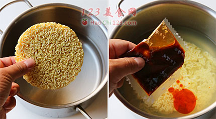 2、锅中加入400ML清水,煮开加入面饼与调味包与脱水蔬菜中火煮3-4分钟。