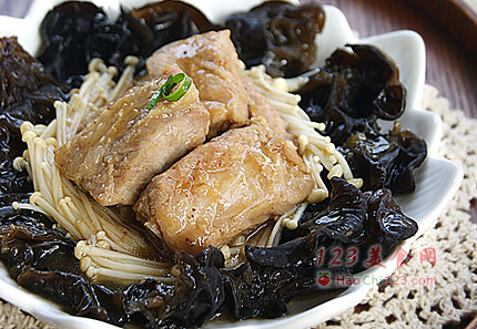 6、将木耳盘中,上面放入腌好的排骨大火蒸制35分钟。