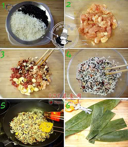 5、可以将泡发的糯米事先蒸熟后才和其它材料混合,也可以混合后再蒸熟,但在包之前都要事先将味道调好。